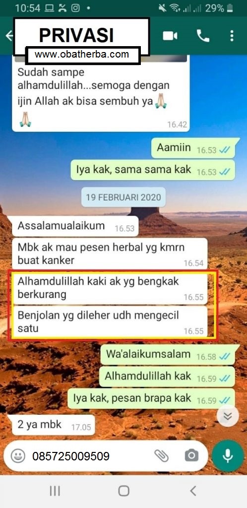 (Ibu.Adrianti Bidan dari Padang, Sumatera Barat) Pada pertengahan tahun 2010, ketiak sekitar payudara saya bengkak, kira-kira ada 3 benjolan. Jika mengangkat tangan rasanya sangat sakit. Saya cemas dengan keadaan itu. Ketika saya membaca majalah arrisalah, saya mendapatkan informasi tentang produk paket herbal kanker tumor alami dari md. Bismillah, saya berikhtiar untuk mencobanya. Saya memesan 2 paket. Setelah habis mengkonsumsi 1 paket, sakit dan nyeri sudah berkurang banyak. Kemudian saya lanjutkan hingga habis 2 paket. Dengan izin Allah tangan saya sudah bisa digerakkan dengan leluasa. Benjolan dan rasa sakit sudah hilang tuntas sampai sekarang. Alhamdulillah aktifitas saya sebagai Bidan berjalan dengan lancar.