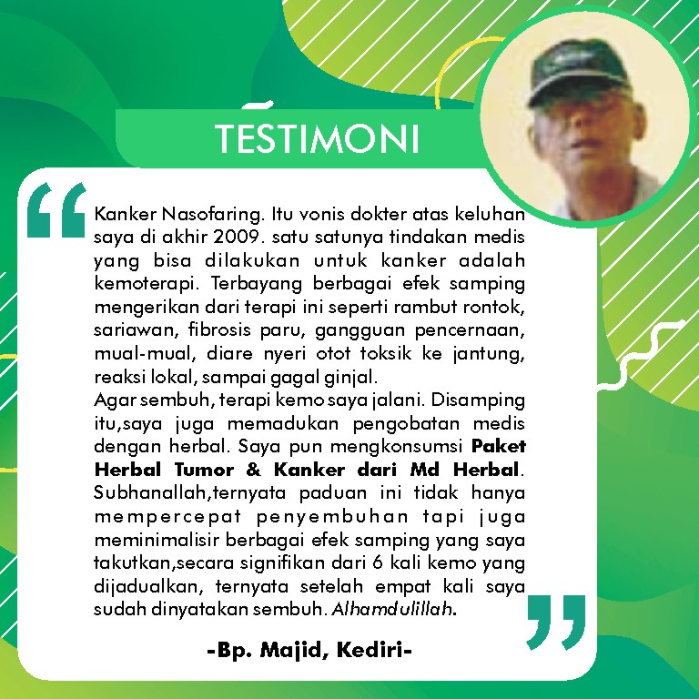 (Bp.Suwa, 53 Th, Kra solo) Keluhan pertama yang saya rasakan adalah mata. Mata sebelah kiri berangsur angsur berkurang penglihatannya. Puncaknya ketika saya dan istri bepergian naik motor di tengah perjalanan tiba tiba penglihatan saya kabur jalan terlihat menjadi sempit dan terasa gelap. Sejak itu saya mulai memeriksakan kedokter mata, di rujuk ke ke dokter syaraf. disitu saya di scan dan ditemukan tumor otak yang menjepit syaraf mata dan dokter menyarankan operasi. Dari hasil konsultasi dan keterangan dari dokter bahwa di operasi pun saya tetap tidak bisa melihat. Kemudian saya putuskan untuk tidak menjalani operasi dan memilih berobat ke berbagai pengobatan alternatif. Namun belum bisa membuahkan hasil. Keluhan setiap hari yang saya rasakan adalah pusing. Alhamdulillah istri ketika sedang berbelanja di toko herbal di wilayah solo karanganyar mengetahui Paket Herbal Tumor dan Kanker dari MD Herbal Alami. Setelah melalui musyawarah kami putuskan untuk mengonsumsinya. Dengan izin Allah setiap kali saya mengonsumsinya rasa pusing di kepala reda dan nyaman.