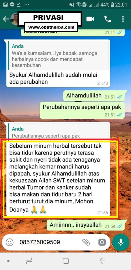 (Ummi Zafirah, Dumai Riau) Saya habis operasi Tumor Payudara 4 tahun yang lalu, sekitar sebulan yang lalu terasa sakit lagi. Kemudian saya di sarankan untuk mengonsumsi Paket Herbal Tumor dan kanker dari MD HERBAL, di awal awal minum saya merasa sakit kepala dan setelah melalui konsultasi ternyata itu bagian dari penyesuain tubuh terhadap herbal. Alhamdulillah denga izin Allah sekarang badan saya merasa nyaman dan tidak sakit lagi setelah minum Paket Herbal Tumor dan Kanker dari MD HERBAL.